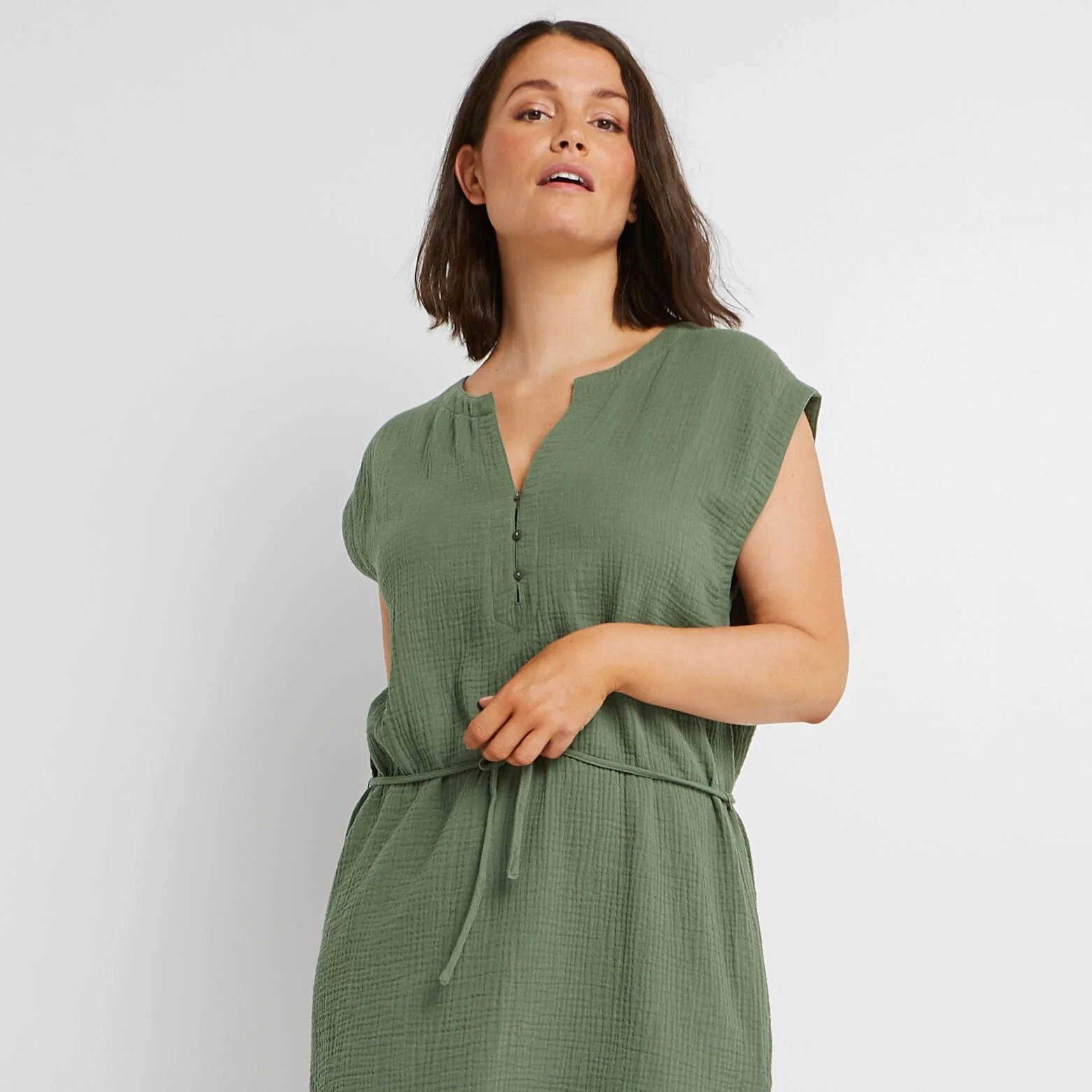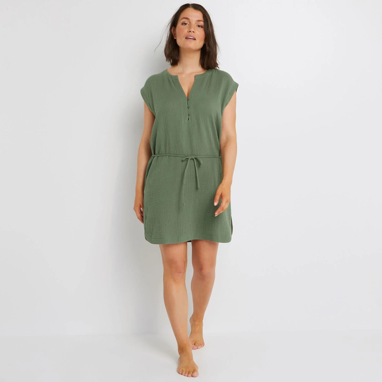 « Toute la fraîcheur et la légèreté de l’été en une tunique conçue en gaze de coton, esprit liquette. » – Coloris uni – Gaze de coton légère et fluide, légèrement reliefée, très agréable sur la peau – Col rond fendu, fermé par 3 boutons esprit coco sur la poitrine – Manches courtes – Fine lanière ton sur ton à nouer à la taille – Coupe courte – Base droite, petites fentes arrondies de chaque côté.
